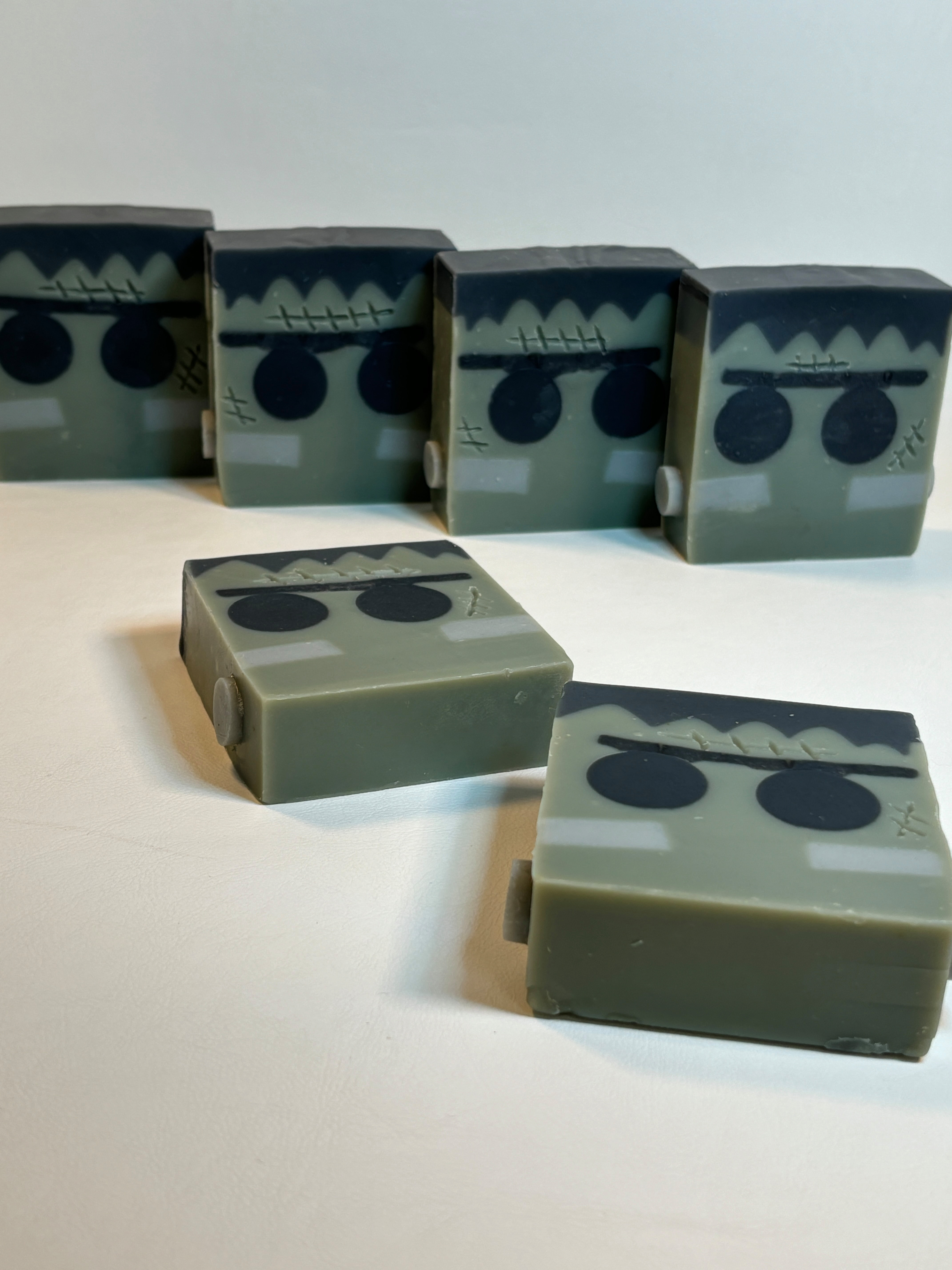 "It's Alive!" Our Frankenstein Soap is a playful artisan creation handcrafted for Halloween. Unscented, with bold green and black design and whimsical stitched detail, it's a spooky seasonal bar that brings fun to every wash.