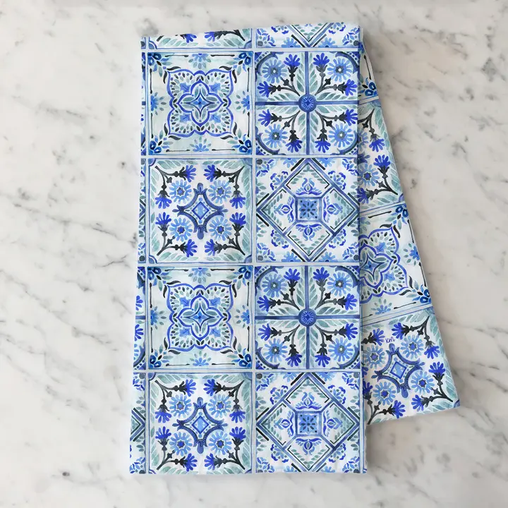Bring timeless elegance to your kitchen with the Blue Mediterranean Tile Tea Towel. Inspired by classic Mediterranean tilework, this watercolor design features rich cobalt blues and soft geometric detail. Printed on absorbent, durable cotton, it's artisan-crafted, functional and beautiful enough to gift.