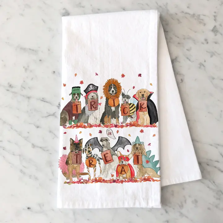 Watercolor pups dressed for trick-or-treating. Artisan cotton towel that's absorbent, durable and delightfully festive.